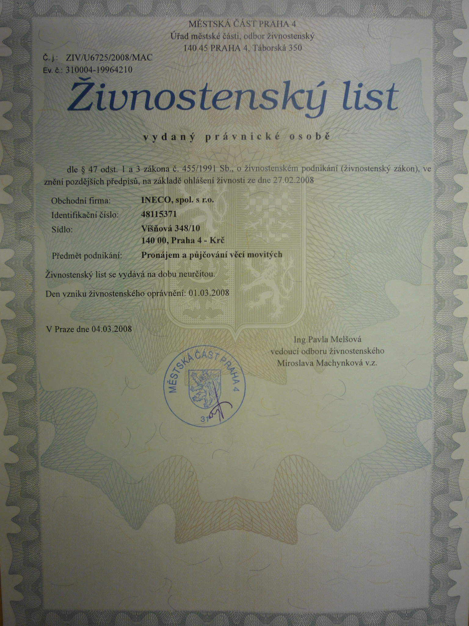 živnostenský list - půjčovna